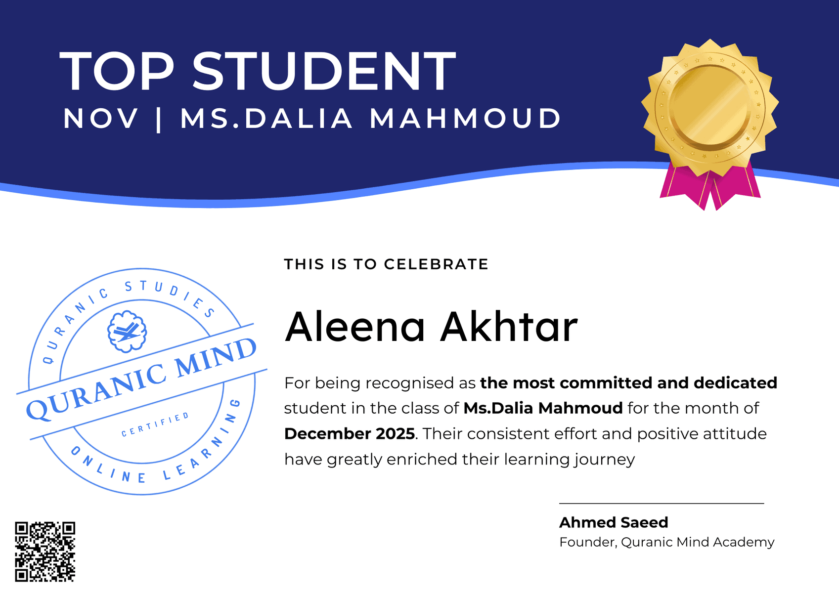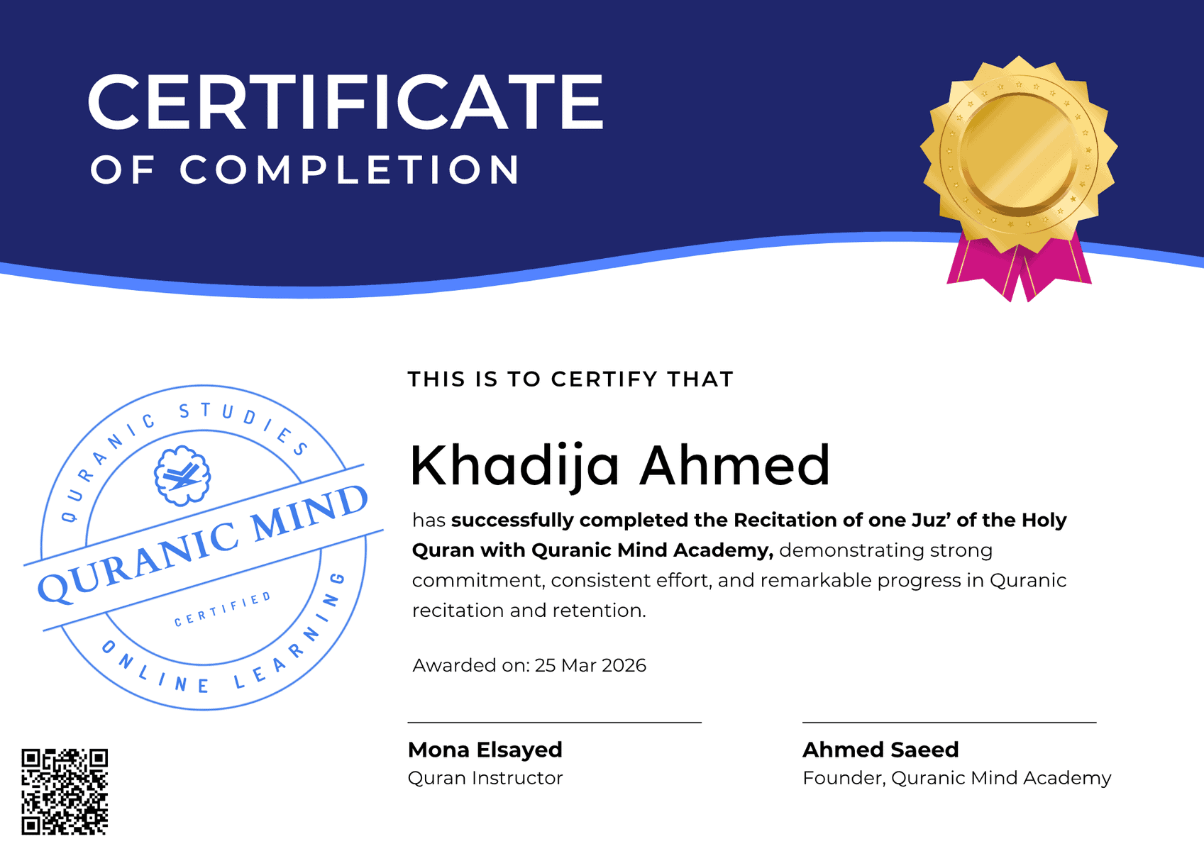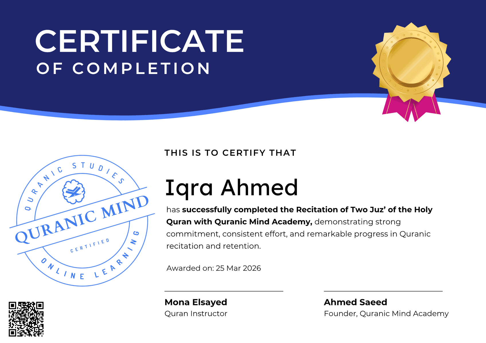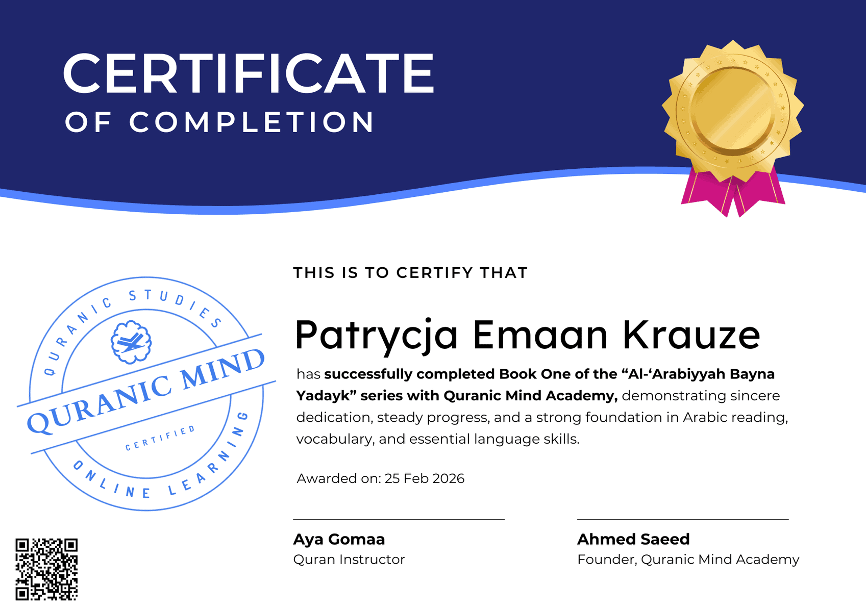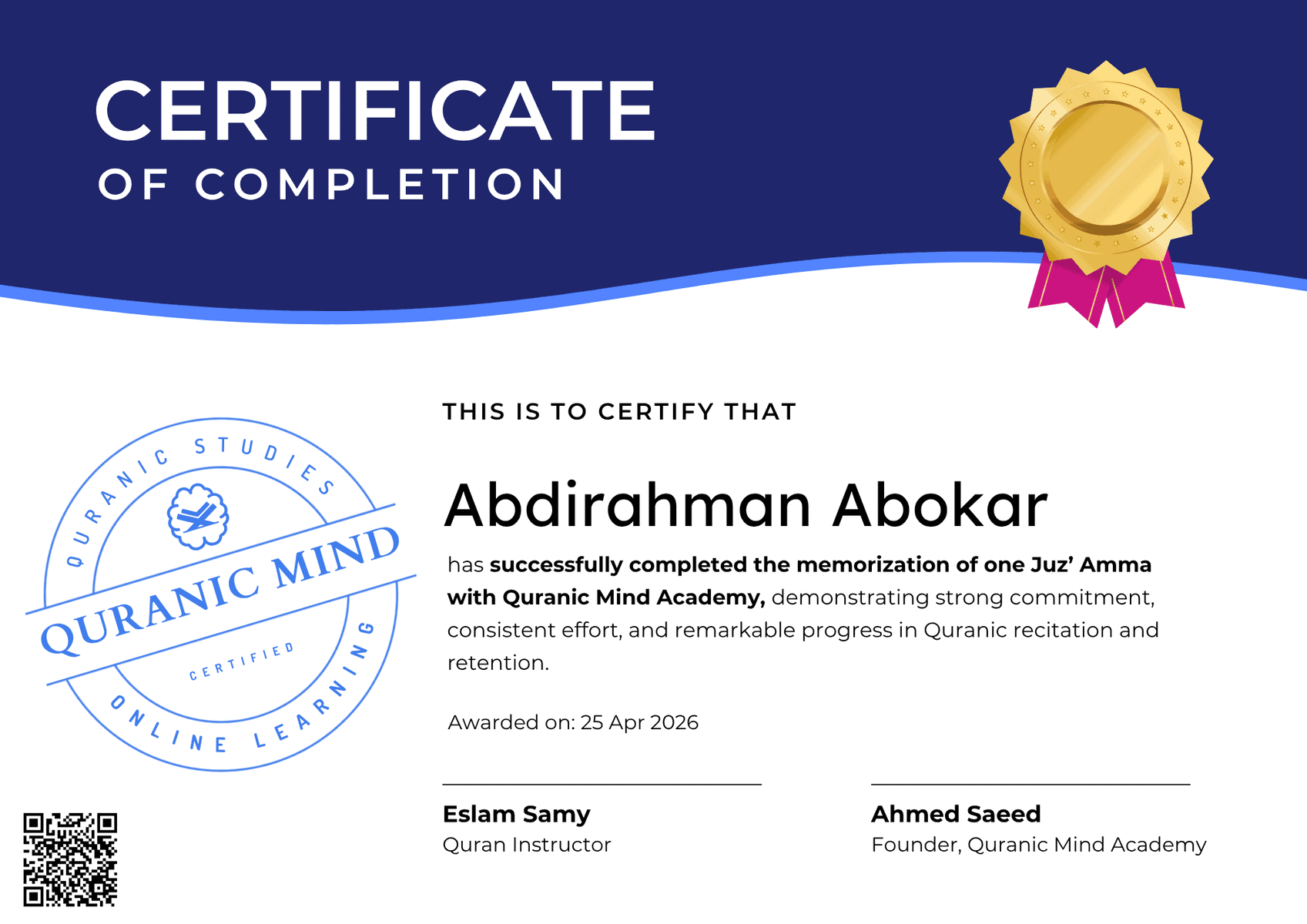 Receive an progress certificate when you finish your Quran or Arabic course. A proud achievement and proof of your learning.